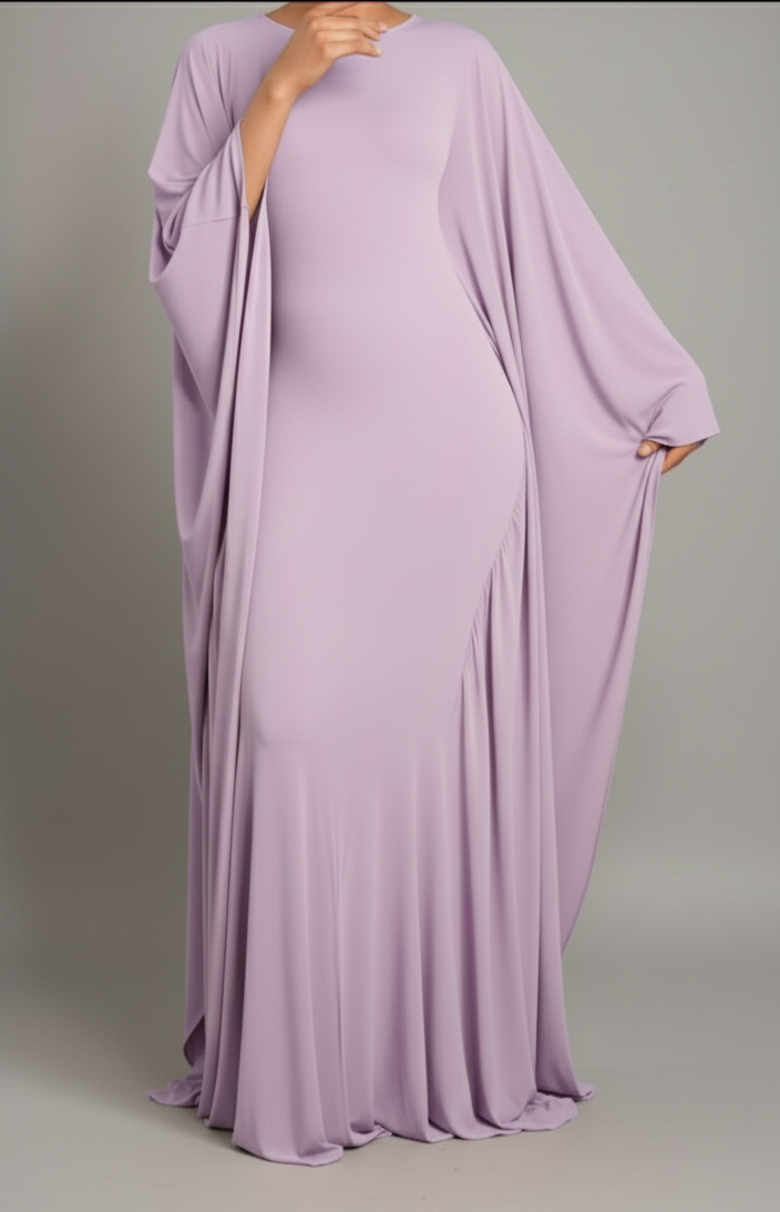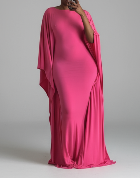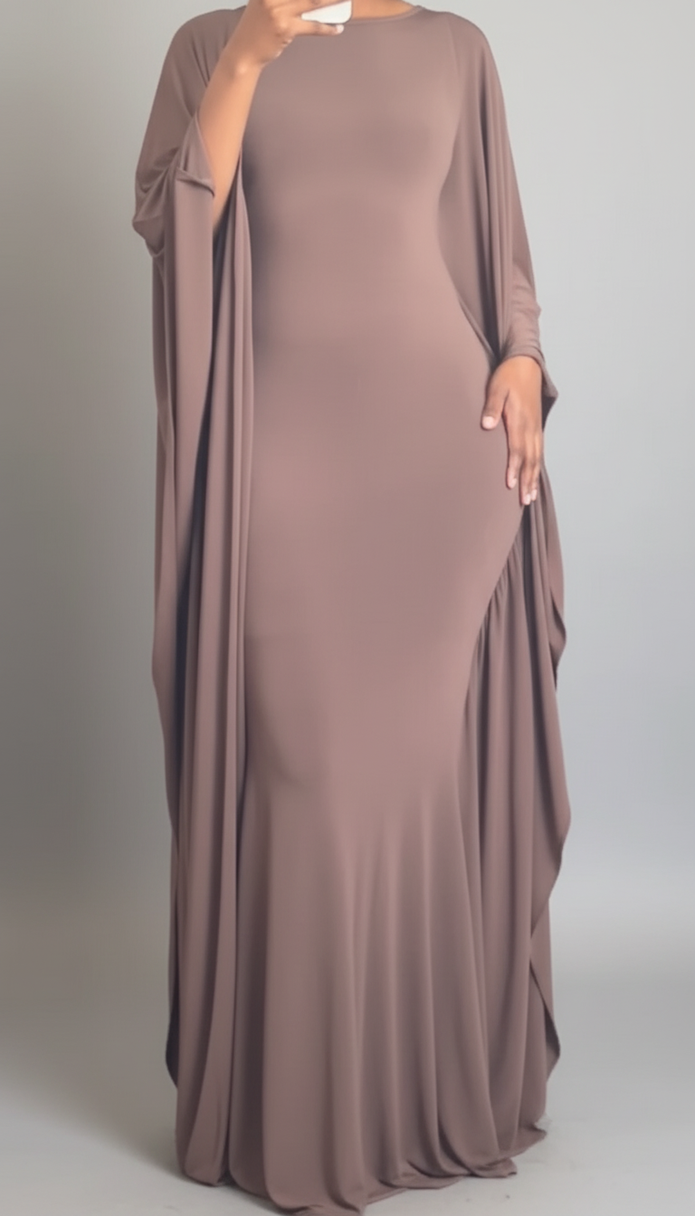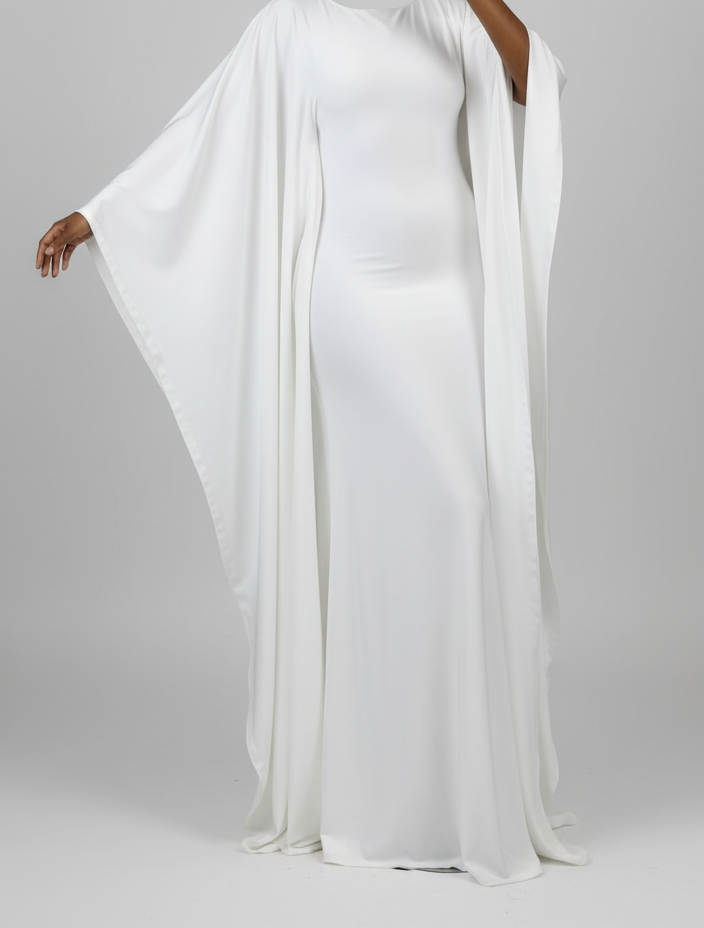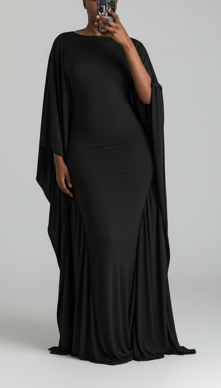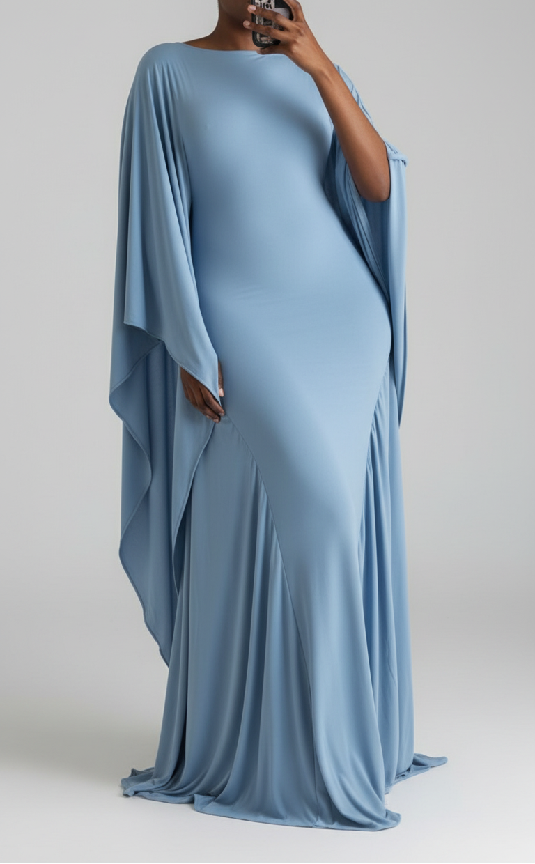 One of its standout features is the dramatic, cape-style sleeves. These sleeves begin at the shoulder and fall all the way down the sides of the dress, creating a fluid, wing-like effect when the wearer moves. The drape adds volume and dimension without overwhelming the silhouette, balancing structure and softness.
